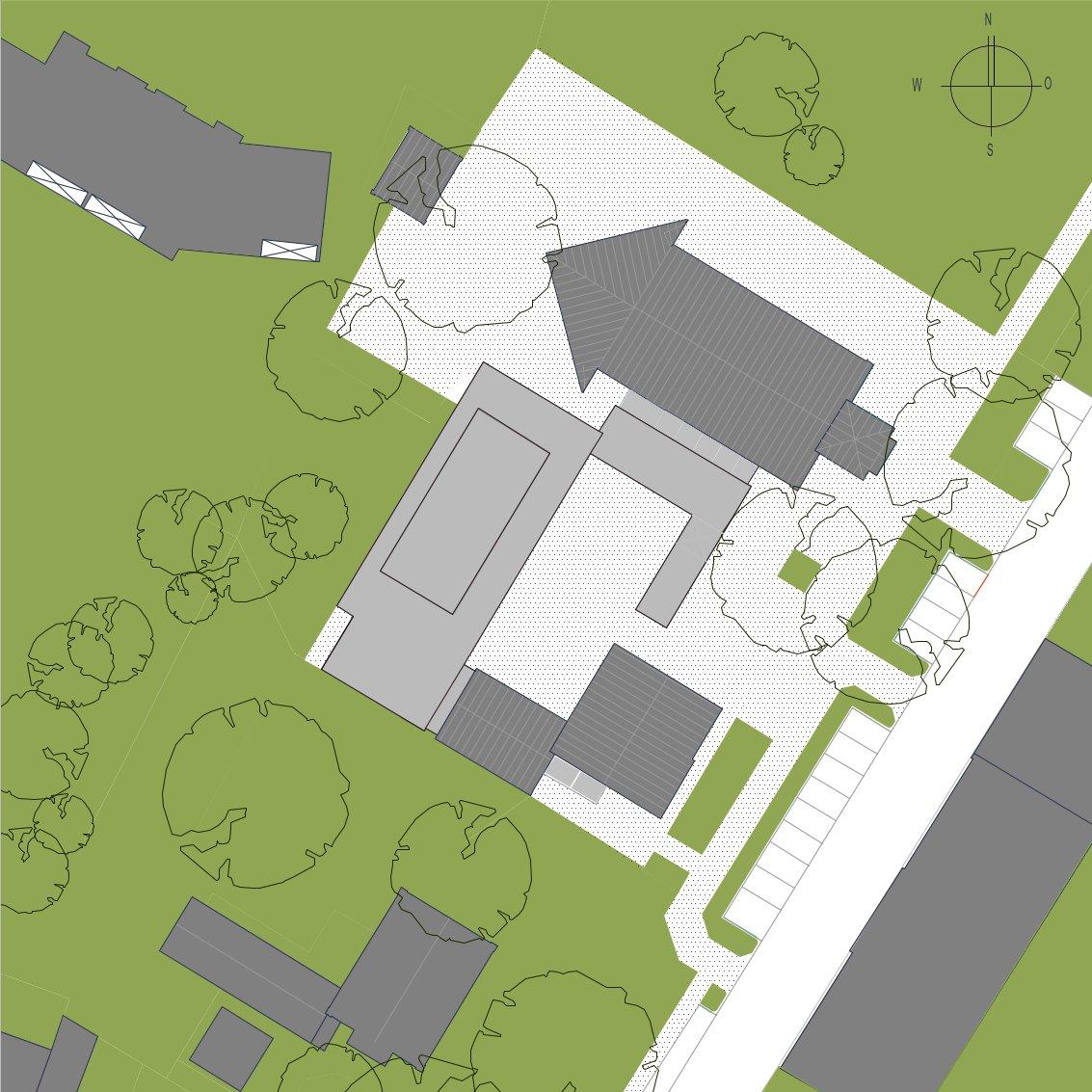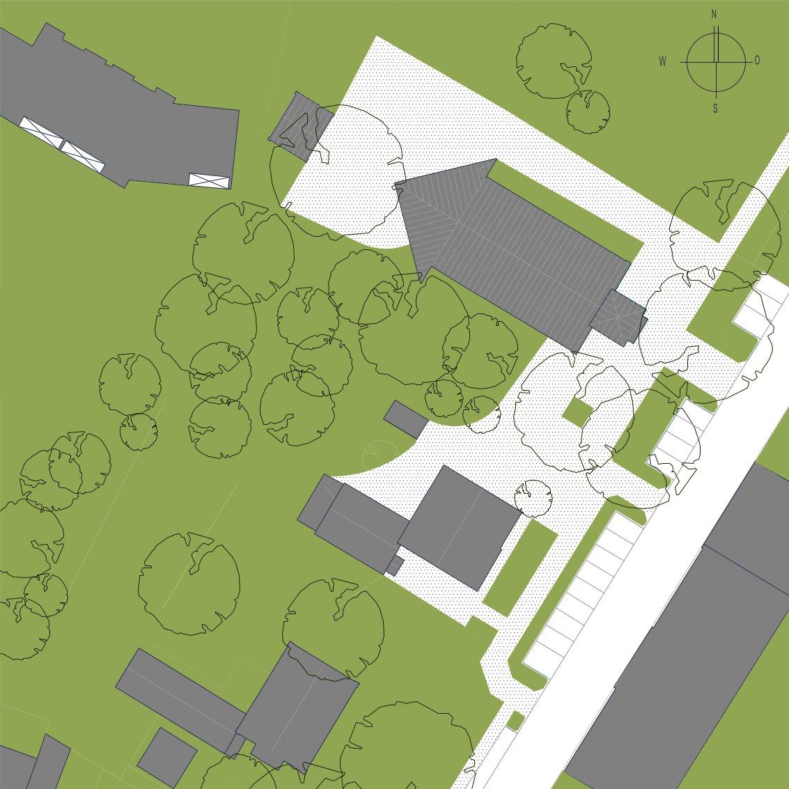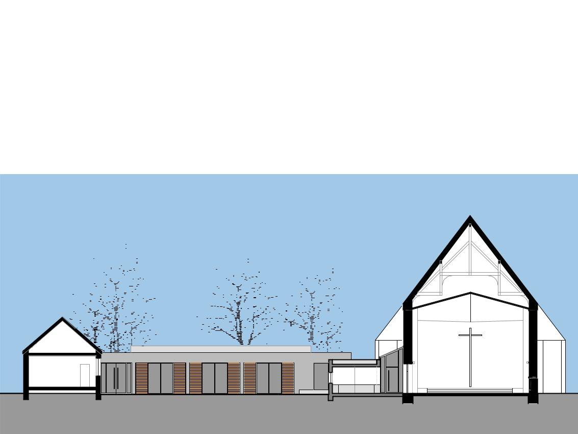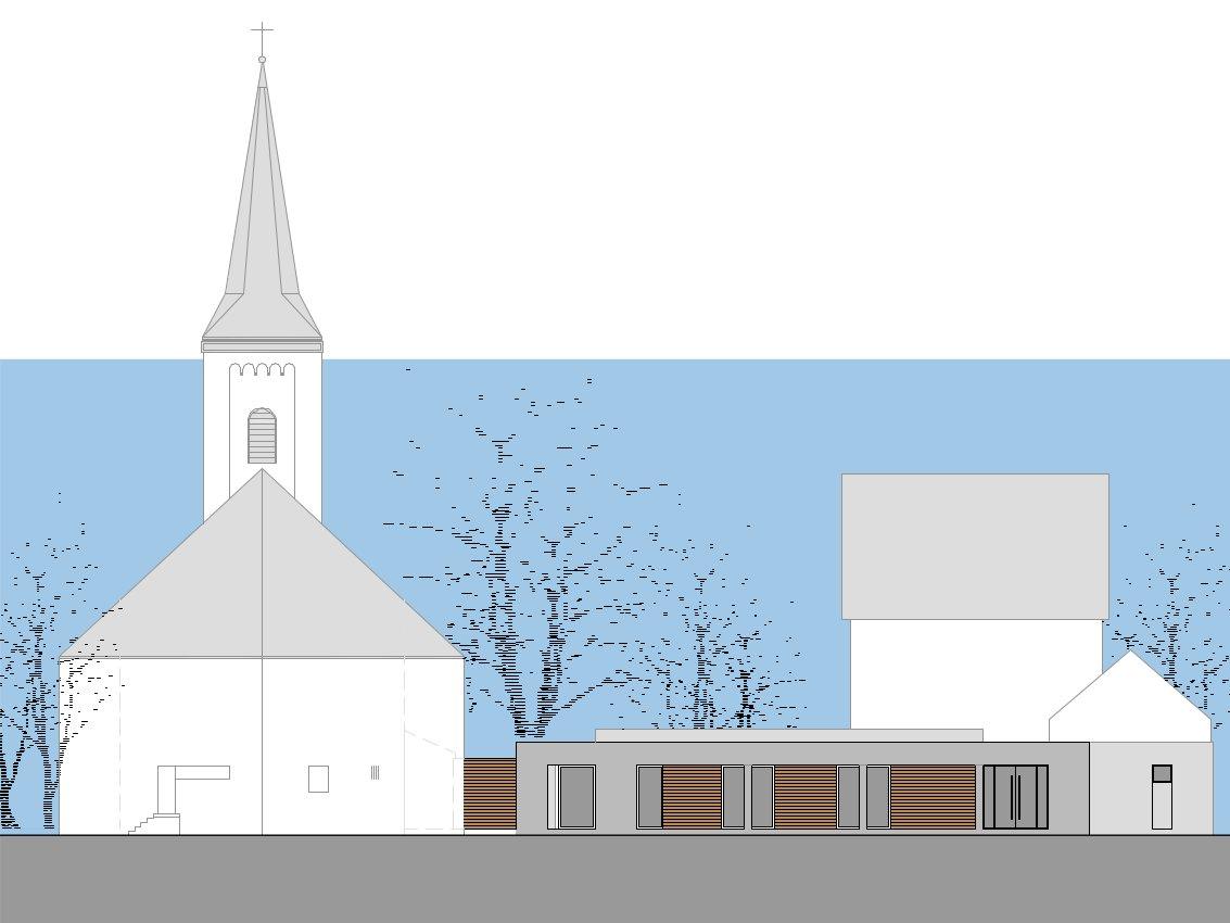 Der eingeschossige Neubau beherbergt einen Bürgersaal, ein Café und mehrere Gruppenräume und ist barrierefrei zugänglich. Die Verwendung warmer Materialien und die schlichte Gestaltungsweise sorgen für einen harmonischen Übergang zwischen den Baukörpern. (Quelle: solingenmagazin.de).